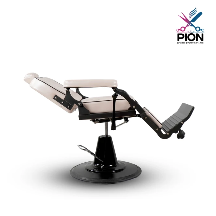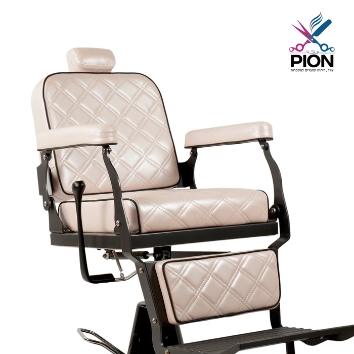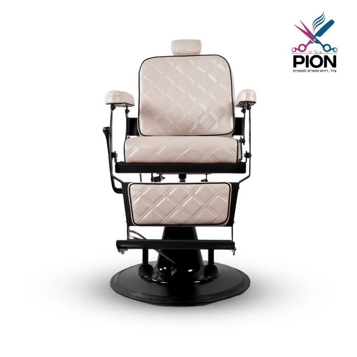 כיסא ברבר מרשים עם ריפוד דמוי עור בגוון פנינה ותפירת יהלום מעודנת, בשילוב שלדת מתכת שחורה עמידה. מתאים במיוחד לברברשופ ומספרות גברים שמבקשות לשדר יוקרה וניקיון עיצובי.