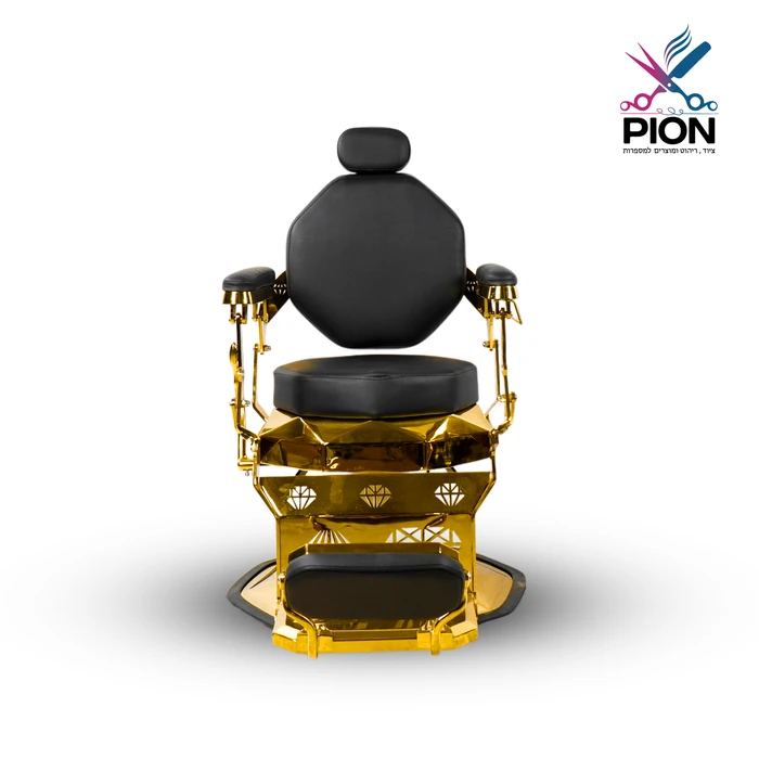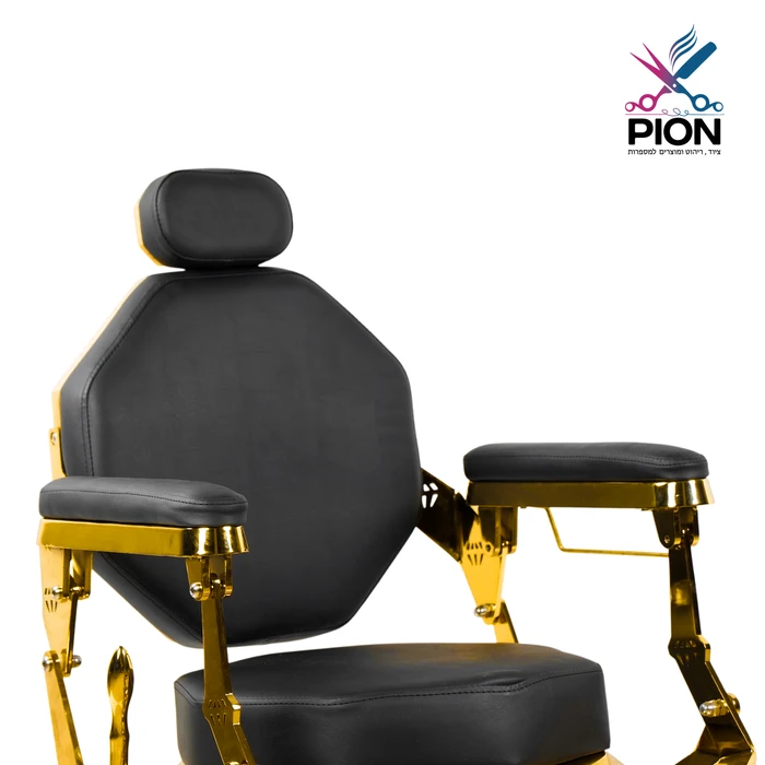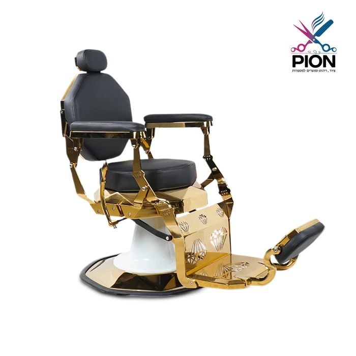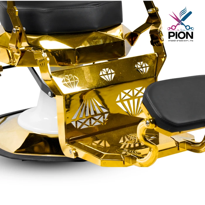 כיסא ברבר עוצר נשימה עם שלדת מתכת מוזהבת, מושב מרופד בגימור שחור ומשענות רחבות. עיצוב הדום הרגליים כולל חיתוכי יהלום מרהיבים – לפרזנטציה שאין לה תחרות.